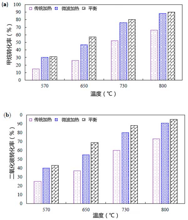 ¡¡¡¡ÎªÁËÑо¿Î¢²¨¼ÓÈȶԸÉÖØÕû·´Ó¦µÄÓ°Ï죬ʹÓ󣹿µÄ»îÐÔÌ¿´ß»¯¼Á¼ÓÈȽøÐÐʵÑé¡£½á¹ûÈçͼ3Ëùʾ¡£¶þÑõ»¯Ì¼ºÍ¼×ÍéµÄƽºâת»¯ÂʺÍÇâÆøºÍÒ»Ñõ»¯Ì¼µÄƽºâ±ÈÒ²»æÖÆÔÚͼ3ÖС£ÈÏΪÁ½¸ö·´Ó¦½øÐÐÆ½ºâ¼ÆË㣬¼´Í¨¹ý¶þÑõ»¯Ì¼ºÍ·´ÏòË®ÃºÆø±ä»»·´Ó¦½øÐм×ÍéÖØÕû¡£¾ÝÐż×ÍéµÄÖØÕû¿ªÊ¼ÓÚCH 4·Ö½â³Éº¬Ì¼³Á»ýÎï¡£ÕâЩ³Á»ýÎï(ÖÁÉÙÊǸ߷´Ó¦ÐÔ³Á»ýÎï)ÔÚÏÂÒ»²½Öб»¶þÑõ»¯Ì¼Æø»¯£¬´Ó¶øÒýÆð»îÐÔλµãµÄÔλÔÙÉú¡£·´ÏòË®ÃºÆø±ä»»·´Ó¦Ò²×÷Ϊ¸±·´Ó¦·¢Éú£¬ÆäÖÐÀ´×Ô¼×Íé·Ö½âµÄһЩÇâÓë¶þÑõ»¯Ì¼·´Ó¦Éú³ÉË®ºÍÒ»Ñõ»¯Ì¼¡£