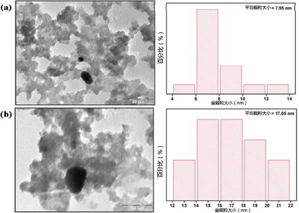 ¡¡¡¡Í¼1ʾÁË»îÐÔÌ¿ÔØ½ðÄÉÃ×´ß»¯¼ÁÉϵĽðÀë×ÓµÄTEMͼÏñ¡£·¢ÏÖ½ðÀë×ӵį½¾ùÖ±¾¶Îª6-8nm£¬¶øÆ½¾ù΢¾§³ß´çΪ6-9nm¡£TEMͼÏñ½øÒ»²½ÏÔʾ½ðÀë×Ó¾ùÔÈ·Ö²¼ÔÚ»îÐÔ֧̿³ÖÎïÉÏ¡£Õâ¿ÉÄܱíÃ÷½ðÀë×ÓÓë»îÐÔ֧̿³ÖÕßÖ®¼ä´æÔÚÇ¿ÁÒÏ໥×÷ÓõĿÉÄÜÐÔ¡£