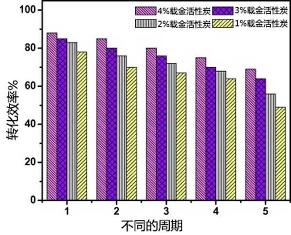 ¡¡¡¡ÎªÁËÁ¿»¯»îÐÔÌ¿ÔØ½ð´ß»¯¼ÁµÄ´ß»¯»îÐÔ£¬¿ÉÒÔʹÓÃת»»ÆµÂÊ×÷Ϊ¶ÈÁ¿¡£×ª»»ÆµÂÊ¿ÉÒÔ¶¨ÒåΪʹÓÃÿ¿Ë»îÐÔ̿ÿµ¥Î»Ê±¼äת»¯³É²úÎï(¶Ô°±»ù±½·Ó)µÄ·´Ó¦Îï·Ö×Ó(¶ÔÏõ»ù±½·Ó)µÄÊýÁ¿¡£»îÐÔÌ¿ÔØ½ð´ß»¯¼ÁÊǿɻØÊյģ¬Ã¿´ÎÔËÐкó£¬Í¨¹ýÀëÐÄ·ÖÀë´ß»¯¼Á¡£¼´Ê¹Ê¹ÓÃ5´Î£¬´ß»¯¼ÁµÄת»¯ÂÊ×î¶à½µ10%¡£Õâͨ¹ý»æÖưٷֱÈת»»Ð§ÂÊÓëÑ»·´ÎÊýÀ´ÏÔʾ£¬Èçͼ3ʾ¡£