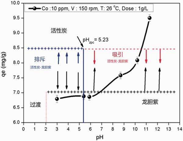 ¡¡¡¡Í¼1£º×÷ΪpHµÄº¯ÊýµÄÁúµ¨×ÏȾÁÏÔÚ»îÐÔÌ¿ÉϵÄÎü¸½Ñݱ䡣
