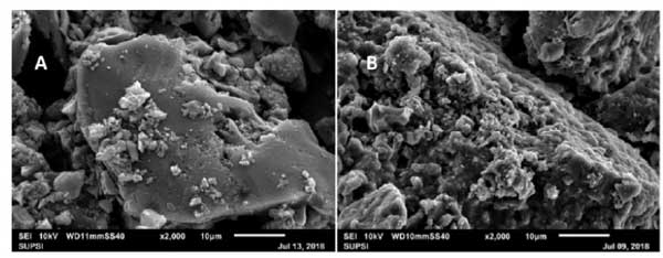 ¡¡¡¡Í¼2£º»îÐÔÌ¿±íÃæµÄɨÃèµç×ÓÏÔ΢ÕÕÆ¬¡£(A)ʹÓÃǰ(B)ÔÚÈÜÆø¸¡Ñ¡×°Öõ¥ÔªÖÐ30·ÖÖÓºó¡£