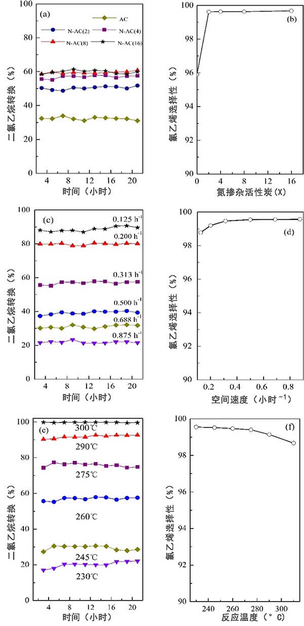 c、显示出二氯乙烷转换为初始氢的一半,而氯乙烯选择性是在任何时候都在99%以上。结果表明氮掺杂活性炭催化剂具有良好的稳定性。