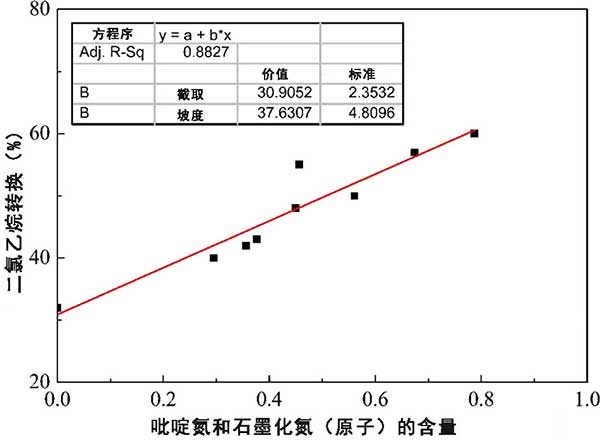 氮掺杂活性炭的活动点如图3所示,随着吡啶氮和石墨氮的增加,二氯乙烷转化率呈线性增加,不论氮资源的变化如何,推断吡啶氮和石墨氮与二氯乙烷的催化脱氯化氢密切相关,是有效的氮原子。