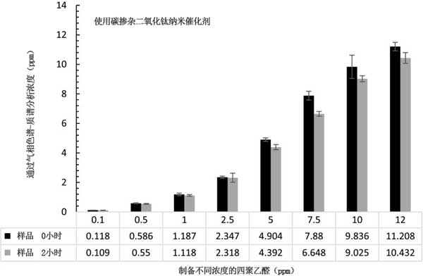 ¡¡¡¡¶þÑõ»¯îѲôÔÓµÄ̼´ß»¯¼Á±»ÈÏΪ¶ÔË®ÖеÄËľÛÒÒÈ©½µ½âÎÞЧ£¬ÌرðÊÇÓë»îÐÔÌ¿Ïà±È¡£Í¼3ʾ³öÁËǰºÍ2Сʱ´¦Àí±»Ì¼²ôÔÓ¶þÑõ»¯îѺóÔÚÈÜÒº¾ÛÒÒÈ©µÄŨ¶È2ÔÚUV-C¹âÄÉÃ×´ß»¯¼Á¡£ÔڽϸߵijõʼŨ¶ÈµÄ½ðÊôÈ©ÈÜÒºÈç5¡¢7.5¡¢10ºÍ12ppmʱ£¬Óë½ÏµÍŨ¶ÈµÄ½µ½âÏà±È£¬½µ½âÉÔ΢¸üÏÔ×Å(2-9%)¡£
