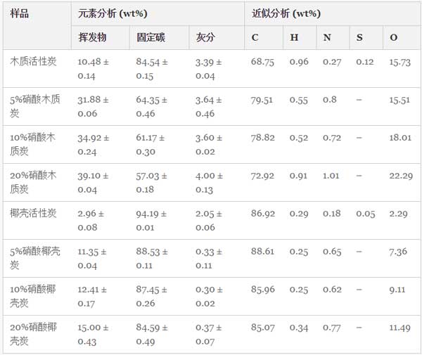 ¡¡¡¡Í¼2£º¹ØÓÚÏõËá´¦ÀíµÄ»îÐÔÌ¿µÄ½üËÆºÍÔªËØ·ÖÎöµÄ½á¹û¡£