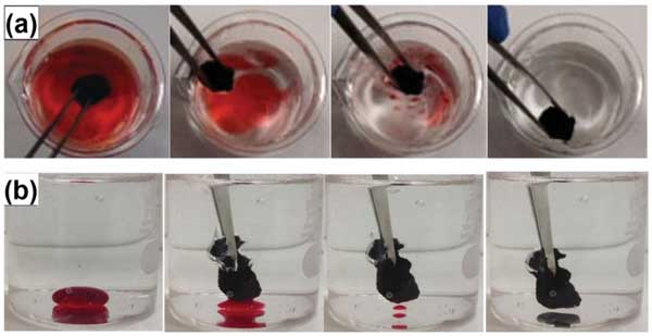 ¡¡¡¡Í¼4£º(a)ͨ¹ýʹÓüä¸ô10ÃëµÄ»îÐÔÌ¿ÆøÄý½ºÏÔʾ¸ýÍéÎü¸½¹ý³ÌµÄÕÕÆ¬¡£(b)ÕÕÆ¬ÏÔʾʹÓûîÐÔÌ¿ÆøÄý½ºÎü¸½ÂȷµĹý³Ì5ÃëÄÚÍêÈ«±»ÎüÊÕ¡£