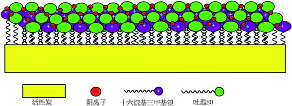 ¡¡¡¡ËùÌá³öµÄͼ2cÖеÄÎü¸½Ä£Ê½ÃèÊöÁË»îÐÔ̿λµãÓëÍÂÎÂ80ºÍHDTMAµÄ»ìºÏÈÜÒºÔÚ½Ó½üÁÙ½ç½ºÊøÅ¨¶ÈϵÄÏ໥×÷Óá£ÔÚͼ2cÖУ¬ÑôÀë×ӺͷÇÀë×Ó±íÃæ»îÐÔ¼ÁµÄÊèË®Á´Óë»îÐÔÌ¿Ï໥×÷ÓÃÊèË®Ï໥×÷Óã¬ÒÔ¼°Îü¸½×´Ì¬Ï±íÃæ»îÐÔ¼ÁÖ®¼äµÄÁ´-Á´²àÏòÏ໥×÷Óá£ÔÚ¸ßŨ¶ÈÏ£¬±íÃæ±äµÃ±¥ºÍ£¬Òò´Ë·¢ÉúÁËÕ³½ºÐγɵķ¢Éú¡£¹ýÁ¿µÄÑôÀë×Ó±íÃæ»îÐÔ¼ÁÔÚÎü¸½×´Ì¬Ï¿ªÊ¼ÉøÍ¸µ¥²ã±íÃæ»îÐÔ¼Á¡£ÊÂʵÉÏ£¬»îÐÔÌ¿¾ßÓÐÎü¸½·Ç¼«ÐԺͼ«ÐÔ»¯ºÏÎïµÄË«ÖØÐÔÖÊ£¬Òò´ËÎü¸½»úÖÆµ¼Ö±íÃæÉϱíÃæ»îÐÔ¼ÁµÄÈ¡Ïò²»Í¬¡£Êèˮβ²¿ºÍÇ×ˮͷ²¿¶¼¿ÉÒÔͨ¹ýÊèË®Ï໥×÷ÓÃ(ÏÔÐÔ)»ò·ÖÉ¢Á¦Óë»îÐÔÌ¿Ï໥×÷Óá£ÔÚͼ2dÖиù¾ÝËüÃÇÏ໥×÷ÓõĻîÐÔ̿λµã£¬HDTMAºÍÍÂÎÂ80·Ö×Ó¿ÉÒÔ²ÉÈ¡²»Í¬µÄÈ¡Ïò¡£µÚ¶þ²ãµÄÐγɿÉÄÜÔ´ÓÚ¾ßÓÐÏà·´È¡ÏòµÄ±íÃæ»îÐÔ¼ÁÖ®¼äµÄÊèË®Ï໥×÷Ó㬻òÕßÉøÍ¸µ½µ¥²ãÖÐÒÔÐγɻìºÏ¹¹Ïó¡£