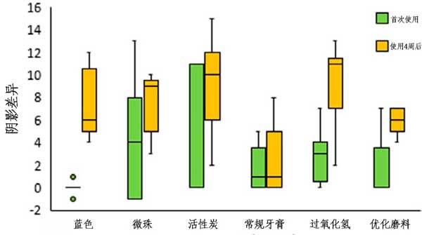 ¡¡¡¡Í¼2£ºÃÀ°×Ч¹ûÓÉÿÖÖÑÀ¸àµÄ»ùÏßÓëÊ×´ÎʹÓúóºÍʹÓÃËÄÖܺóÖ®¼äµÄÉ«µ÷µ¥Î»²îÒì±íʾ¡£