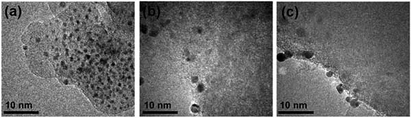 ¡¡¡¡Í¼1£º(a)250¡æ(b)350¡æºÍ(c)450¡æÏÂÈȻµÄÔØÒø´Ø»îÐÔÌ¿´ß»¯¼ÁÑùÆ·µÄTEMͼÏñ¡£