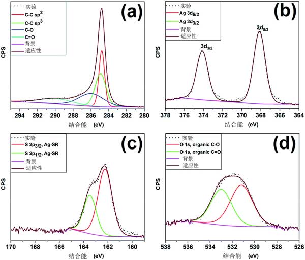 ¡¡¡¡Í¼2ÏÔʾÁËËùÖÆ±¸µÄ»îÐÔÌ¿ÑùÆ·µÄ×é³ÉÔªËØµÄXPS¹âÆ×¡£XPS²âÁ¿Í¼ÏÔʾ̼£¬Òø£¬ÁòºÍÑõ×÷Ϊ¹¹³ÉÔªËØµÄ´æÔÚ¡£S 1p¹âÆ×ÅäÓжà¸ö¸ß˹·ÖÁ¿£¬ÕâЩÎïÖÖͨ³£´æÔÚÓÚ»îÐÔÌ¿±íÃæÉÏ¡£Í¼2(b)·Ö±ðÏÔʾÁ˶à¸ö·å£¬ËüÃÇÓëÁã¼Û̬µÄÒøÔ×ÓÒ»Ö¡£S 2p¹âÆ×µÄ¸ß·Ö±æÂʹâÆ×µÄ·´¾í»ý£¬Èçͼ2(c)Ëùʾ£¬ÏÔʾÁ½¸ö×ÔÐý¹ìµÀ·ÖÁÑΪ〜1.2 eVµÄ·å¡£O 1s¹âÆ×ÏÔʾ³ö²»¶Ô³ÆµÄÇúÏߣ¬±íÃ÷»îÐÔÌ¿±íÃæ´æÔÚ¶àÖÖÑõÎïÖÊ(ͼ2d)¡£¹âÆ×µÄ·´¾í»ý²úÉúÁ½¸ö£¬Æä¿É·Ö±ð¹éÒòÓÚ»îÐÔÌ¿±íÃæµÄC-OºÍC OÎïÖÊ£¬Òò´Ë²»´æÔÚ½ðÊôÑõ»¯ÎïÎïÖÊ¡£×ÜÖ®£¬XPS½á¹û±íÃ÷Áò´¼ÑÎÅäÌå±£³Ö¸½×ÅÔÚÒø´Ø±íÃæµÄ±íÃæÉÏ£¬²¢ÇÒÔÚ»îÐÔÌ¿ÑùÆ·Öв»·¢ÉúÒøÔ×ÓµÄÑõ»¯¡£