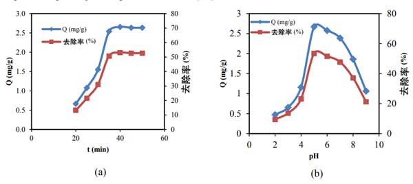 ¡¡¡¡Í¼2£º½Ó´¥Ê±¼ä(a)ºÍpH(b)¶Ô»îÐÔÌ¿¿Ç¾ÛÌǸ´ºÏĤ¶ÔCd2 +µÄÎü¸½ÈÝÁ¿(Q)µÄÓ°Ïì¡£
