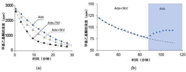 图4:(a)在不存在和存在电场的情况下,甲基乙基酮的浓度。(b)在先打开然后关闭电场的测试中,甲基乙基酮浓度。
