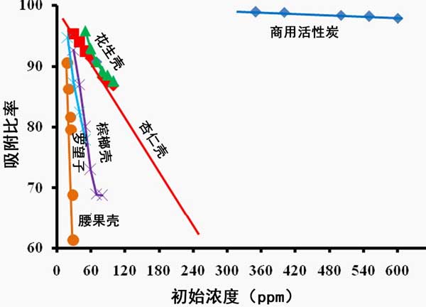 ¡¡¡¡ÔÚ²»Í¬µÄ³õʼŨ¶ÈÏ£¬¶Ô(ÐÓÈʿǣ¬»¨Éú¿Ç£¬éÄÀƿǣ¬ÂÞÍû×ӿǺÍÑü¹û¿Ç)»îÐÔÌ¿ºÍ»îÐÔÌ¿ÉϵÄÌìÇàAȾÁÏÈ¥³ý³Ì¶È½øÐзÖÅúÎü¸½Ñо¿£¬Ôڹ̶¨¼ÁÁ¿£¬ÔÚÊÒÎÂ(30 ± 1 °C)ϽӴ¥Ê±¼äΪ30·ÖÖÓ¡£Ëæ×ųõʼŨ¶ÈµÄÔö¼Ó£¬ËùÓлîÐÔÌ¿ÉÏȾÁϵÄÈ¥³ýÂÊÇ÷ÓÚ½µµÍ(ͼ1)¡£Õâ¿ÉÄÜÊÇÓÉÓÚȱ·¦¸ß³õʼŨ¶ÈµÄÌìÇàAËùÐèµÄ¿ÉÓûîÐÔλµãËùÖ¡£ÔڽϵÍŨ¶ÈµÄÌìÇàA´óÁ¿Îü¸½ÁËÁôϸü¶àÊýÁ¿µÄ»îÐÔ²¿Î»µÄÎü¸½¼Á£¬ÔڽϸßŨ¶È½ÏСÊýÁ¿µÄ»îÐÔλµãÈÔÈ»¿ÉÓá£