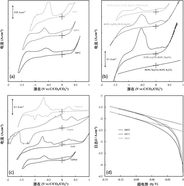 ¡¡¡¡Í¼1£º(a)»îÐÔÌ¿µÄζȣ¬(b)·¢Éú³Á»ýµÄÈÛÈÚ̼ËáÑεç½âÖÊ£¬ÒÔ¼°(c)·¢Éú³Á»ýµÄ»ù°å¡£(d)ÓëÔÚ500-700°CµÄζÈϳÁ»ýµÄ̼µÄ̼³Á»ý¿ªÊ¼ÓйصÄTafel·åµÄÒõ¼«TafelÇúÏߺͼÆËãµÄTafelÏß(ÐéÏß)¡£