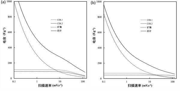 ¡¡¡¡Í¼4£ºÉ¨ÃèËÙÂʶÔ(a)ÒÔ»îÐÔÌ¿ºÍÆäËû±ê×¼Ìõ¼þÒÔ¼°(b)»îÐÔÌ¿¶Ô×ܵçÈݵűÏ×µÄÓ°Ïì¡£C D±íʾÓÉÓÚÀ©É¢ÒýÆðµÄµçÈÝ£¬¶øC DL1ºÍC DL2·Ö±ð±íʾÓëÄÉÃ׺Í΢¿×±íÃæ»ýÒÔ¼°Íⲿ̼±íÃæ»ýÏà¹ØµÄË«²ã¡£