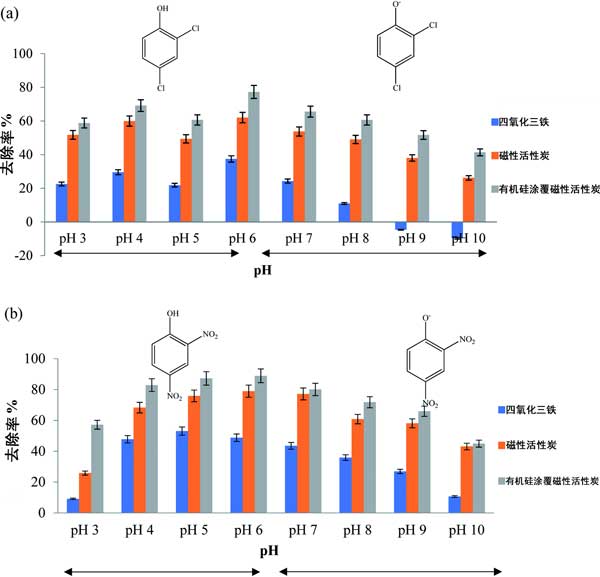 ¡¡¡¡×÷Ϊ×îÖØÒªµÄ¿ØÖƲÎÊýÖ®Ò»µÄÈÜÒºµÄpHÖµ¿ÉÄÜ»áÓ°ÏìÎü¸½¹ý³ÌÖÐÎü¸½¼ÁµÄ½áºÏÄÜÁ¦¡£´ÓÀíÂÛÉϽ²£¬pH¿ÉÒԸıäÎü¸½¼Á»îÐÔλÉϹÙÄÜÍŵĽâÀ룬»îÐÔÌ¿µÄ±íÃæµçºÉÒÔ¼°±»Îü¸½Îï·Ö×ӵĴæÔÚ״̬¡£·ÖÎöÎïµÄp K aֵΪ2,4-DNP=4.1ºÍ2,4-DCP=7.9¡£ÓÉÓÚ2£¬4-DCPµÄp K aÖµ½Ï¸ß£¬Òò´ËºÜÄÑ»ñµÃ½ÏµÍµÄpH¡£Òò´Ë£¬ÔÚpHΪ3µÄ·¶Î§ÄÚ£¬½øÐÐÖÁpH 10.Á½ÖÖ·ÖÎöÎïµÄ×îÓÅ»¯Ê¹ÓÃ0.01 M NaOHºÍ0.01 M HClµ÷½Ú·ÖÎöÎïÈÜÒºµÄpH¡£Ê¹Ó÷ÖÅú¼¼Êõ½øÐиÃʵÑ飬ÆäÖÐÿÖÖpHµ÷½ÚºóµÄ·ÖÎöÎïÈÜÒº·Ö±ðÔÚ20 mgÎü¸½¼ÁµÄ´æÔÚÏÂÕñÒ¡60·ÖÖÓ¡£Í¼2(a)ºÍ(b)ÏÔʾÁËÁ½ÖÖ·ÖÎöÎïµÄÈ¥³ýÇ÷ÊÆ¡£