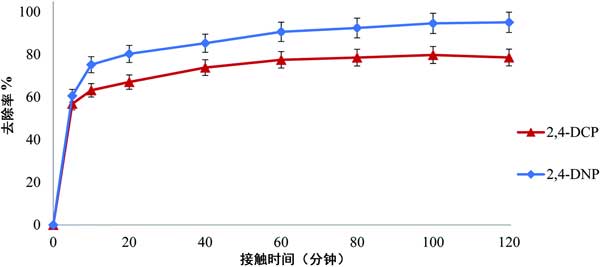¡¡¡¡Í¼3£º½Ó´¥Ê±¼ä¶ÔÈ¥³ý2,4-DNPºÍ2,4-DCPµÄÓ°Ïì¡£