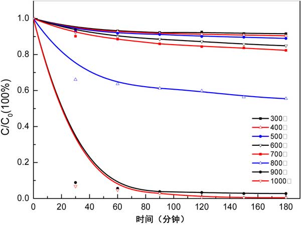 图2表明,在不同温度下煅烧并用过硫酸盐活化的活性炭样品降解苯酚的能力大不相同。所有活性炭样品均在120 分钟内降解了苯酚 。当煅烧温度提高到800.0 °C以上时,苯酚的降解效果显着提高。在900.0 °C 下煅烧的活性炭降解苯酚的效率是在800.0 °C 下煅烧活性炭的两倍。活性炭的降解度为900.0 °C(98.12%)和1000.0 °C(99.58%)表现出相似的效果 。