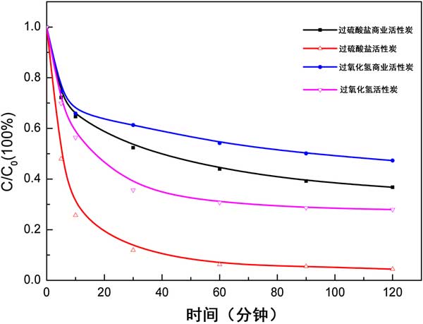 图3:两种活性炭与两种不同氧化剂的相互作用转化苯酚。