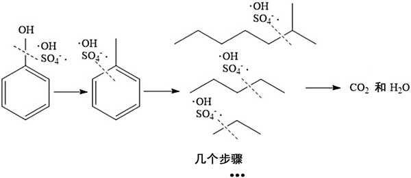 图4显示了苯酚的降解过程。首先破坏连接苯酚中羟基的化学键,然后打开苯环以形成通过单键连接的单链。随着反应的进行,单链之间的化学键被破坏,并形成具有较少碳原子数的单链。将链重组为新的长链的过程是由于氧化剂剂量不足。然而,随着反应的进行,诸如这些短链和新形成的长链的中间体被进一步降解。在此过程中,一些单链会随着反应时间的增加而重组形成一条更长的新单链。随着这一过程的继续,长单链逐渐分解成短链,然后苯酚矿化成二氧化碳和水。