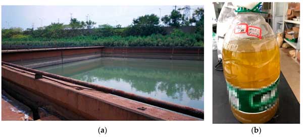 ¡¡¡¡Í¼1£º²ÉÑùµØµãºÍ·ÏË®Ñù±¾¡£(a)ÎÛË®´¦Àí³Ø;(b)δ¾´¦ÀíµÄ·ÏË®ÑùÆ·¡£
