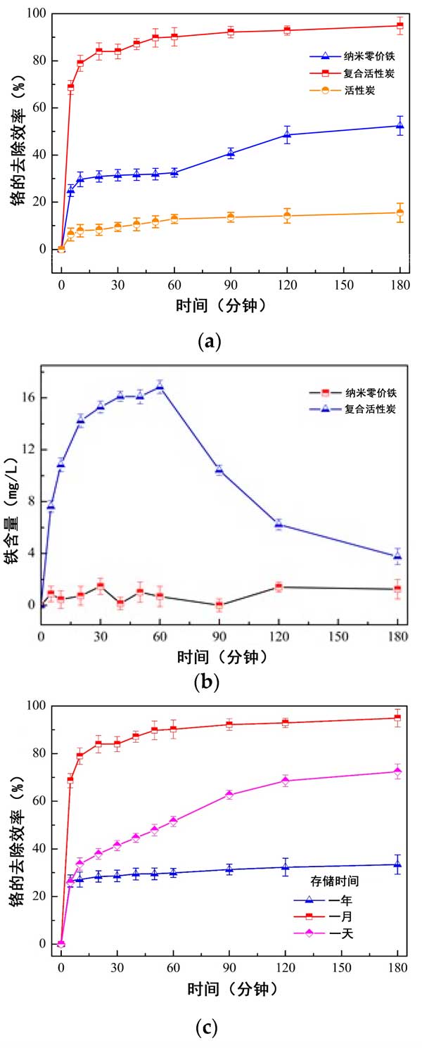 ¡¡¡¡Í¼3£ºÊ¹Óò»Í¬²ÄÁϵÄ×ܸõµÄ±È½ÏÈ¥³ýЧÂÊ¡£(a)»îÐÔÌ¿£¬nZVIºÍ¸´ºÏ²ÄÁÏ;(b)ÈÜÒºÖÐÌúº¬Á¿µÄ±ä»¯;(c)»îÐÔÌ¿¸´ºÏ²ÄÁϾßÓв»Í¬µÄ´æ´¢Ê±¼ä¡£