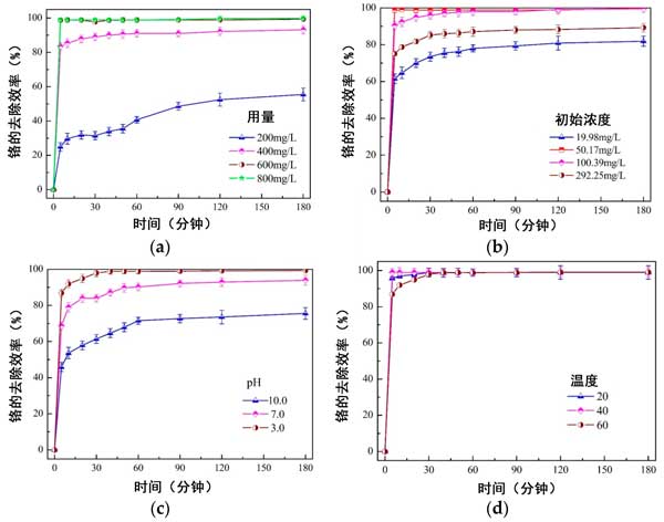 ¡¡¡¡ÈçÔÚËùʾͼ4C£¬×ܸõµÄÈ¥³ýÂÊ´Ó99.12%½µÖÁ73.56%£¬Ëæ×ÅpHÖµµÄ3.0ÖÁ10.0µÄÔö¼Ó¡£Õâ±íÃ÷½ÏµÍµÄpHÖµÓÐÀûÓÚ»îÐÔÌ¿¸´ºÏ²ÄÁÏ»¹Ô¸õ¡£Ôڽϵ͵ÄpHֵϻáÊͷŸü¶àµÄH +£¬Õâ¿ÉÒÔ¼ÓËÙCr 6+»¹ÔΪCr 3+²¢Ïû³ýnZVI¿ÅÁ£±íÃæµÄÇâÑõ»¯ÑÇÌú£¬´Ó¶øÉú³ÉеĻîÐÔλµã¡£ÁíÍ⣬ζȵÄÔö¼Ó»á¼ÓËÙCrµÄÒÆ¶¯ÐÔºÍÀíÂÛÉÏÌá¸ß»¯Ñ§·´Ó¦ËÙÂÊ£¬µ«¶Ôʵ¼Ê¹ý³ÌÖÐûÓÐÃ÷ÏÔµÄЧ¹û£¬Èçͼ4d¡£ÔÒò¿ÉÄÜÊǵ±Ìṩ×ã¹»µÄnZVI»îÐÔλµãʱζȲ»ÊÇÖØÒªÒòËØ¡£