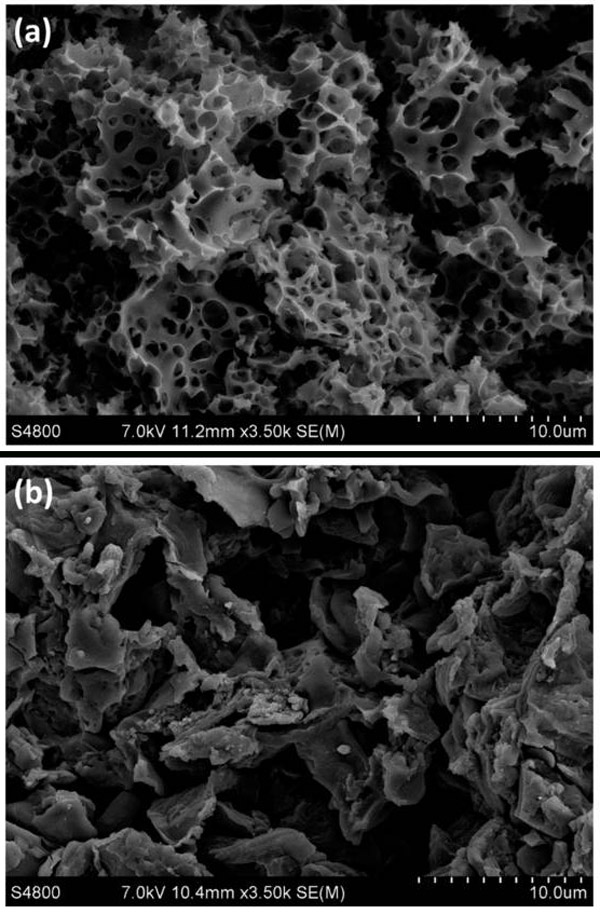 ¡¡¡¡Í¼1£º(a)»¯Ñ§»î»¯»îÐÔÌ¿ºÍ(b)ÎïÀí»î»¯»îÐÔÌ¿ÑùÆ·µÄSEMÏÔ΢ÕÕÆ¬¡£