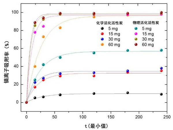 ¡¡¡¡»îÐÔÌ¿Á¿µÄÓ°Ï죺×îºó£¬Ñо¿ÁË»îÐÔÌ¿Îü¸½Á¿µÄÓ°Ïì¡£½«Å¨¶ÈΪ5 mg·L -1µÄïáÈÜÒºÓ벻ͬÁ¿µÄÁ½ÖÖ»îÐÔÌ¿(5¡¢15¡¢30ºÍ60 mg)½Ó´¥¡£½á¹û»æÖÆÔÚͼ5ÖС£