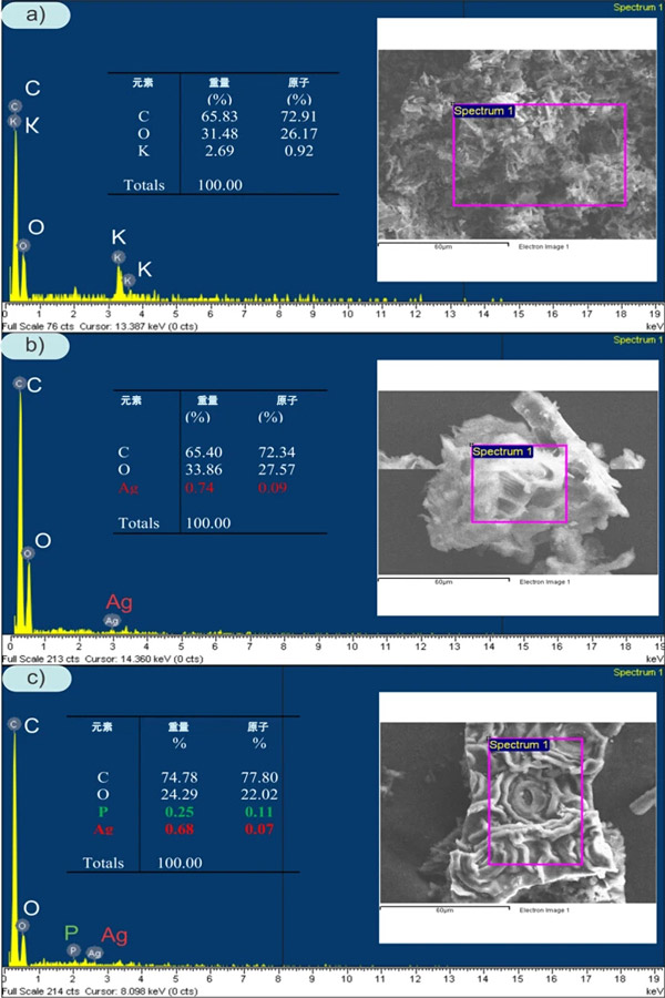 ¡¡¡¡Í¼1£º»îÐÔÌ¿(a)ºÍÔØÒø»îÐÔÌ¿µÄEDS¹âÆ×ÔÚ(b)֮ǰºÍÖ®ºóÁ×ËáÑÎÎü¸½(c)¡£
