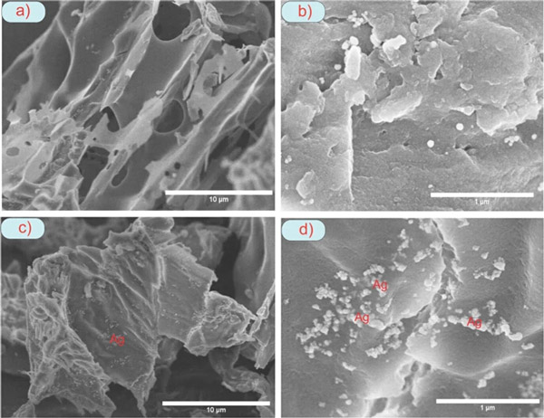 ¡¡¡¡Í¼2£º(a£¬b)»îÐÔÌ¿ºÍ(c£¬d)ÔØÒø»îÐÔÌ¿µÄSEMͼÏñ¡£