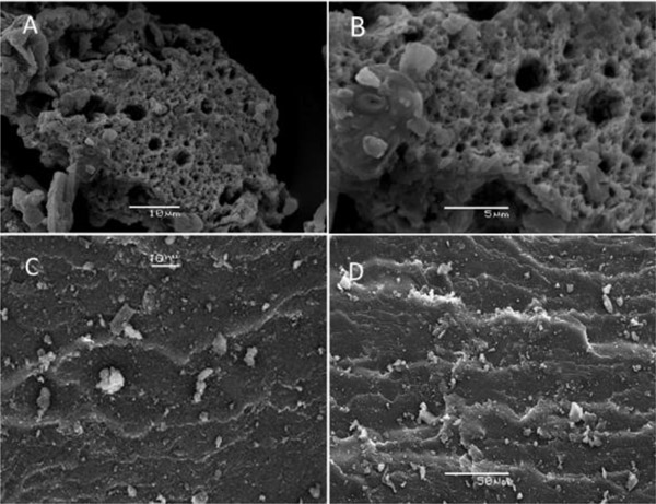图1:A、B活性炭,C、D煤的SEM显微照片。