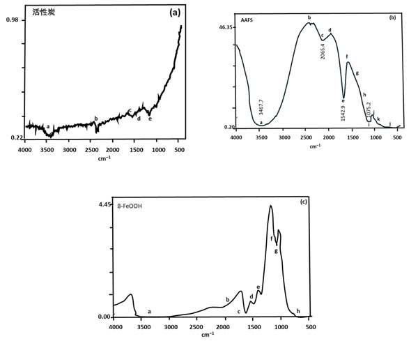 ¡¡¡¡Í¼1£º»îÐÔÌ¿£¬AAFSºÍB-FeOOHµÄFTIR¹âÆ×¡£