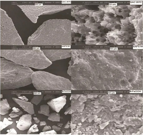 ¡¡¡¡Í¼2ÏÔʾÁËÎü¸½¼ÁµÄSEMͼÏñ¡£»îÐÔÌ¿¾§Á£µÄ˺ÁѱßÔµÒ²ÏÔʾ³öÄÚ²¿“¿×”¡£ÆäÄÚ²¿½á¹¹¿ÉÒÔ±»ÈÏΪÊÇ̼°åµÄʯīÐͷֲ㡣»î»¯¹ý³ÌÖвúÉúµÄ¿×϶ºÍ´óÁ¿Ëéмµ¼ÖÂÁËÕâÖÖÎü¸½¼ÁµÄÒ×ËéÐÔ¡£AAFS¾§Á£ÏÔʾ³öÏàͬµÄÇãбÐÎ×´£¬±íÃæ¿´ÆðÀ´¹â»¬ÇÒ¾ßÓоùÔȵÄÍ¿²ã¡£ÔÚ¸ü´óµÄ·¶Î§ÄÚ£¬½ö¿É¼ûºÜÉÙµÄÁÑ·ì»ò¿×¶´£¬Õâ±íÃ÷±íÃæ»ýÖ÷ÒªÔÚÍⲿ¡£β-FeOOHµÄ±íÃæ¾ßÓиߴàÐÔ£¬Òò´Ë±íÃæ¹â»¬ÇÒ´øÓдóÁ¿Ëéм¡£¶à¿×½á¹¹ÓëSEMÕÕÆ¬·Ç³£ÎǺÏ(ͼ2)£¬ËµÃ÷ÁË»îÐÔÌ¿µÄƬ״½á¹¹¼°ÆäÖÚ¶àµÄ¿Õ¶´£¬¶øÌú»¯ºÏÎïÔòÏԵù⻬£¬Ö»ÓкÜÉÙµÄÁÑÎÆ¡£»î»¯¹ý³ÌÖвúÉúµÄ¿×϶ºÍ´óÁ¿Ëéмµ¼ÖÂÁËÕâÖÖÎü¸½¼ÁµÄÒ×ËéÐÔ¡£¿¼ÂǹæÄ££¬Öп׺ʹó¿×ÉÏ¿´µ½ÕÕÆ¬(³ß´çÒÔÉÏ2.5 μ M)¡£β-FeOOHµÄ±íÃæÒ×Ë飬Òò´Ë±íÃæ¹â»¬£¬´øÓдóÁ¿Ëéм¡£¸Ã¿Ì¶È²»ÔÊÐíÈËÃÇÇø·Ö³àϼʯ΢¾§(FeOOHµÄβÐÎʽ)µÄÌØÕ÷¸ËÑ©ÇÑÐÎ×´¡£