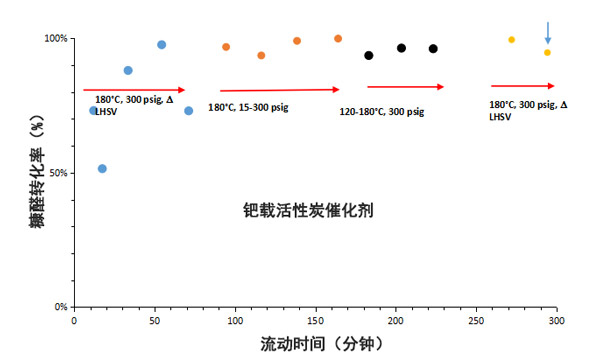 ¡¡¡¡Í¼1£ºÊ¹ÓûîÐÔÌ¿´ß»¯¼Á½øÐп·È©¼ÓÇâµÄÉú²úʱ¼ä·ÖÎö£¬¼ýÍ·±íʾ½«ÒÒËáÌí¼Óµ½½øÁÏÖеÄʵÑé¡£