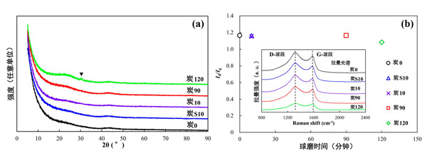 ¡¡¡¡Í¼1:XRDͼ°¸ºÍÑÐĥʱ¼äÖ®¼äµÄ¹ØÏµºÍ»îÐÔÌ¿µÄÖµ¡£(a)XÉäÏßÑÜÉäͼ°¸£¬(b)ÀÂü¹âÆ×Öµ¡£