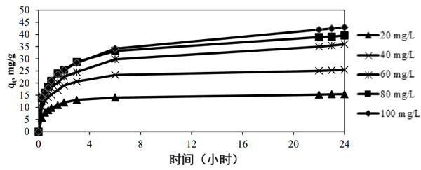 ¡¡¡¡Í¼2˵Ã÷Á˼׻ù»Æ³õʼŨ¶ÈºÍ½Ó´¥Ê±¼ä¶Ô30°CʱÎü¸½Æ½ºâµÄÓ°Ïì¡£Ëæ×ųõʼȾÁÏŨ¶È´Ó20 mg/LÔö¼Óµ½100 mg/L£¬·¢ÏÖÆ½ºâʱµÄȾÁÏÎü¸½Á¿Ôö¼Ó¡£ÕâЩ±íÃ÷³õʼŨ¶ÈÌṩÁ˱ØÒªµÄÇý¶¯Á¦£¬ÒÔ¿Ë·þ¶ÔȾÁÏ·Ö×ÓÔÚË®ÏàºÍ¹ÌÏàÖ®¼ä´«ÖʵÄ×èÁ¦¡£³õʼŨ¶ÈÔ½¸ß£¬Å¨¶ÈÌݶȵÄÇý¶¯Á¦Ô½´ó¡£´ÓͼÖпÉÒÔ¿´³ö£¬½Ï¸ßµÄ³õʼŨ¶ÈµÄȾÁÏÈÜÒºÐèÒª¸ü³¤µÄ½Ó´¥Ê±¼ä²ÅÄܴﵽƽºâ¡£³õʼŨ¶ÈΪ20-40 mg/LµÄȾÁÏÈÜÒº´ïµ½Æ½ºâËùÐèµÄ½Ó´¥Ê±¼äԼΪ3-5Сʱ¡£