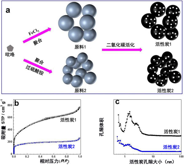 ¡¡¡¡Í¼1ºÍÒ»¸öʾ³öÁË»îÐÔÌ¿²ÄÁϵÄÖÆ±¸·½·¨¡£Ê×ÏÈ£¬Ê¹Óò»Í¬µÄÑõ»¯¼Á(FeCl 3ºÍ¹ýÁòËáï§)ͨ¹ýßÁ¿©µ¥ÌåµÄÑõ»¯¾ÛºÏ·´Ó¦ºÏ³ÉÁËÁ½ÖÖÑùÆ·¡£Æä´Î£¬¶ÔÔ²ÄÁϽøÐжþÑõ»¯Ì¼»î»¯´¦Àí£¬ÒÔÖÆ±¸¾ßÓи߿×϶ÂʵĻîÐÔÌ¿¡£½øÐеªÎü¸½²âÁ¿ÒÔ»ñÈ¡¹ØÓÚËûÃǵıȱíÃæ»ýµÄÊý¾Ý¡£