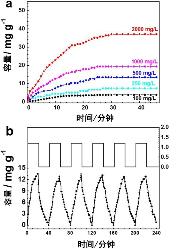 ¡¡¡¡½øÐÐÅú´¦ÀíģʽµçÈÝÈ¥Àë×ÓʵÑéÒÔÑо¿ËùÖÆ±¸²ÄÁϵĵçÎü¸½ÐÔÄÜ¡£Í¼3Ò»¸öʾ³öÁË¿ÉÒԹ۲쵽ÔÚ1.2 V.²»Í¬Å¨¶ÈµÄNaClÈÜÒº»îÐÔÌ¿-1µç¼«µÄµçÎü¸½ÐÐΪÔÚµÚ15·ÖÖÓÄÚ¼±¾çÔö¼Ó£¬Îü¸½Æ½ºâÎü¸½ÄÜÁ¦£¬¿ÉʵÏÖÔÚ´óÔ¼30·ÖÖÓÄÚ¡£ÏÔÈ»£¬µçÎü¸½ÈÝÁ¿ËæNaClŨ¶ÈµÄÔö¼Ó¶øÔö¼Ó¡£ÓëËüÃǵĸ߱íÃæ»ýºÍ±ÈµçÈÝÏàËÆ£¬ÔÚ1.2 VµçѹÏ»îÐÔÌ¿-1ÔÚNaClÈÜÒºÖÐÏÔʾ³ö±È»îÐÔÌ¿-2¸ü¸ßµÄÎü¸½ÄÜÁ¦¡£¿¼Âǵ½ÏàËÆµÄ±íÃæ»¯Ñ§×é³É£¬ËùÖÆ±¸µÄ»îÐÔÌ¿-1µç¼«µÄµçÈÝÈ¥Àë×ÓÐÔÄܸÄÉÆÖ÷Òª¹éÒòÓڽϴóµÄ±íÃæ»ýºÍ¶à¿×½á¹¹£¬´Ó¶øÎªÀë×ӵĴ洢ºÍÔËÊäÌṩÁ˳ä×ãµÄ»îÐÔÇøÓòºÍ¿Õ¼ä¡£»îÐÔÌ¿-1µç¼«µÄÎü¸½ÐÔÄÜÓÅÓÚÐí¶àÆäËûÑùÆ·¡£ÊµÑé±íÃ÷µª²ôÔÓ¶ÔµçÈÝÈ¥Àë×ÓÐÔÄÜÓÐÀû¡£¶ÔÓÚʵ¼ÊÓ¦Ó㬻¹ÆÀ¹ÀÁ˵çÈÝÈ¥Àë×ӵ缫µÄÔÙÉúÐÔÄÜ¡£Í¼3bʾ³öÁË»îÐÔÌ¿µç¼«ÔÚ500mg L-1NaClµç½âÖÊÖеÄÔÙÉúÐÐΪ¡£ÏÔÈ»£¬»îÐÔÌ¿µç¼«ÔÚ6¸öÎü¸½-½âÎüÑ»·ÖбíÏÖ³öÁ¼ºÃµÄÔÙÉúÐÔÄÜ¡£ÕâЩ½á¹û±íÃ÷£¬»îÐÔÌ¿¾ßÓкܴóµÄµçÈÝÈ¥Àë×ÓÓ¦ÓÃDZÁ¦¡£
