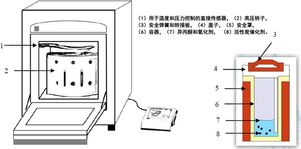 ¡¡¡¡Í¼1ÊÇʵÑéÊÒÉèÖõÄʾÒâͼ¡£Î¢²¨Ïû½âʵÑéÕ¾ÓÃÓÚ²úÉú΢²¨ÄÜÁ¿¡£ÔÚ±ê×¼·´Ó¦ÔËÐÐÖУ¬½«10 mLÒì±û´¼ÈÜÒº×ªÒÆµ½100 mLÌú·úÁúÈÝÆ÷ÖС£ÔÚ½Á°èϽ«ËùÐèÌå»ýµÄ¹ýÑõ»¯ÇâÈÜÒº(30%)×¢Èëµ½ÈÝÆ÷ÖС£È»ºó£¬½«Ò»¶¨Á¿µÄ»îÐÔÌ¿´ß»¯¼ÁÌí¼Óµ½¸ÃÒì±û´¼ÈÜÒºÖУ¬²¢ÔÚ΢²¨Ïû½âʵÑéÊÒÕ¾ÖÐÕÕÉä120Ãë¡£ÔÚËùÓÐʵÑéÖУ¬ÈÜҺζȾù±£³ÖÔÚ80±2°C£¬MW¹¦Âʱ£³ÖÔÚ600W¡£