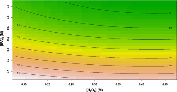 ¡¡¡¡Í¼2ÏÔʾÁË×ÜÓлú̼ȥ³ýЧÂʰٷÖÊýÓëH 2 O 2Ũ¶ÈºÍ³õʼÒì±û´¼Å¨¶ÈµÄ¹ØÏµ¡£´ÓÏìÓ¦ÂÖÀªÖпÉÒÔ¿´³ö£¬½«Òì±û´¼³õʼŨ¶È´Ó0.038 MÔö¼Óµ½0.743 M£¬µ¼ÖÂTOCÈ¥³ýÂÊ´Ó85.17%¼±¾ç½µµÍµ½46.29%¡£¿ÉÄÜÊÇÒòΪÔÚÏàͬµÄÓ¦Ó÷´Ó¦Ìõ¼þÏ£¬×ÔÓÉ»ù(OH•)µÄÊýÁ¿±£³Öºã¶¨£¬¶ø³õʼÒì±û´¼Å¨¶ÈÈ´Ôö¼ÓÁË¡£»»¾ä»°Ëµ£¬Ïà¶Ô½ÏÉÙÁ¿µÄÑõ»¯»ùÍÅ¿ÉÓÃÓÚ¹¥»÷Òì±û´¼·Ö×Ó¡£ÀàËÆµØ£¬×ÜÓлú̼½µ½âÐÔÄÜÒ²Ëæ×ÅH 2 O 2Ũ¶ÈµÄÔö¼Ó¶øÖð½¥½µµÍ¡£¹ýÁ¿µÄH 2 O 2¿ÉÄÜ´Ù½ø×Ô¶¯Çå³ý·´Ó¦µÄ·¢Éú¡£