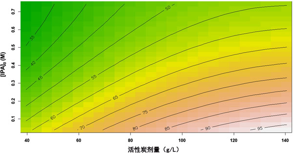 ¡¡¡¡Í¼3չʾÁË»îÐÔÌ¿¼ÁÁ¿ºÍ³õʼÒì±û´¼Å¨¶È¶Ô×ÜÓлú̼ȥ³ýЧÂʵÄÏ໥×÷Ó᣿ÉÒÔÇå³þµØ¹Û²ìµ½£¬ÔÚ³õʼÒì±û´¼Å¨¶ÈΪ0.1 Mʱ£¬»îÐÔÌ¿´Ó40 g/LÔö¼Óµ½140 g/L»áʹ×ÜÓлú̼ȥ³ýЧÂÊ´Ó55%ÏÔ×ÅÌá¸ßµ½92%¡£»îÐÔÌ¿´ß»¯¼ÁÓÃÁ¿Ô½´ó£¬²úÉúµÄôÇ»ù×ÔÓÉ»ùºÍÈȵãÊýÁ¿¾ÍÔ½´ó£¬µ¼ÖÂ×ÜÓлú̼µÄ½µ½âÂÊÔ½¸ß¡£¸Ã½á¹ûÓëÆäËûÑо¿Ò»Ö£¬¼´´ß»¯¼ÁÔÚ΢²¨ÓÕµ¼µÄ´ß»¯Ñõ»¯¹ý³ÌÖÐÆð×ÅÖØÒª×÷ÓᣴӵȸßÏßͼ¿ÉÒԵóö½áÂÛ£¬»îÐÔÌ¿¼ÁÁ¿·¶Î§Îª108ÖÁ123 g/LÊÇ×ÜÓлú̼ȥ³ýÂʱȽϺá£