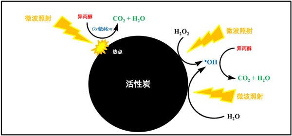 ¡¡¡¡Í¼4ÖÐÏÔʾ»úÀí¡£ÔÚ΢²¨·øÉäÏ£¬»îÐÔÌ¿¿ÉÒÔÇ¿ÁÒÎüÊÕ΢²¨ÄÜÁ¿£¬ËæºóÔÚ»îÐÔÌ¿±íÃæÐγÉÐí¶à“Èȵ㔡£¸ü¾ßÌåµØËµ£¬ÔÚ΢²¨·øÕÕÆÚ¼ä£¬»îÐÔÌ¿±íÃæÉϵÄπµç×ӵ͝ÄÜÔö¼ÓÁË£¬ÕâʹËüÃÇÄܹ»´Ó²ÄÁÏÖÐÌø³ö£¬Í¨¹ýµçÀëÖÜΧµÄ´óÆø¶øÐγÉ``Èȵã''¡£ÕâЩ“Èȵ㔵ÄζÈͨ³£¿ÉÒÔ´ïµ½1200°C£¬µ¼ÖÂÑ¡ÔñÐÔ¼ÓÈÈ£¬·Ö×ÓÐýת²¢×îÖÕ½µµÍ»¯Ñ§·´Ó¦µÄ»î»¯ÄÜ¡£Òò´Ë£¬ÔÚÈܽâÓÚË®ÖеÄÑõÆø(O 2)µÄ´æÔÚÏ£¬Îü¸½ÔÚ»îÐÔÌ¿±íÃæÎ¢“Èȵ㔸½½üµÄÒì±û´¼¿ÉÒÔѸËٷֽ⡣