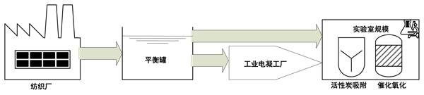 ¡¡¡¡À´×Ô·ÄÖ¯³§µÄ·ÄÖ¯·ÏË®±»´æ´¢ÔÚ¾ùºâ¹ÞÖУ¬²¢×ªÒƵ½¹¤Òµ¹æÄ£µÄµçÄý´¦Àí³§¡£´Ëºó£¬Èçͼ1Ëùʾ£¬ÔÚʵÑéÊÒÖнøÐÐÁË´ß»¯³ôÑõÑõ»¯£¬È»ºó½øÐÐÁËÎü¸½½×¶Î¡£µ¥´ÎÎü¸½£ºÔÚ´ß»¯³ôÑõÑõ»¯Ö®Ç°£¬¶ÔÓÚËùÓд߻¯¼Á£¬Îü¸½ÊµÑé¾ù½øÐÐÁË30·ÖÖÓ¡£½«»îÐÔÌ¿´ß»¯¼ÁÖ±½ÓÌí¼Óµ½·ÏË®ÖС£Îü¸½ÔÚÓë³ôÑõ»¯´¦ÀíÏàͬµÄ·´Ó¦Æ÷ÖнøÐУ¬µ«Ã»ÓгôÑõÈë¿ÚÒÔά³Ö¾ùÔȵÄʵÑéÌõ¼þ¡£ËùÓÐʵÑéÌõ¼þÓë³ôÑõ»¯´¦ÀíÆÚ¼äÏàͬ¡£Î¶ȱ£³ÖÎȶ¨²¢ÇÒµÈÓÚ23±1¡æ¡£»îÐÔÌ¿´ß»¯³ôÑõ»¯£ºÊ¹ÓÃÓëÎü¸½ºÍ³ôÑõ»¯ÏàͬµÄ·´Ó¦Æ÷½øÐд߻¯³ôÑõ»¯¡£ËùÓÐʵÑéÌõ¼þÓë³ôÑõ»¯´¦ÀíÆÚ¼äÏàͬ¡£¶ÔÓÚËùÓд߻¯¼Á£¬Ã¿´Î´ß»¯¼ÁŨ¶ÈΪ0.5g/L¡£·´Ó¦ºó£¬½øÐд߻¯¼ÁµÄ¹ýÂË(0.45μm¹ýÂËÆ÷)¡£