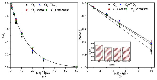 ¡¡¡¡Í¼2£ºÊ¹ÓÃÈýÖÖÀàÐ͵Ĵ߻¯¼Á(a)ºÍÄâ³ýÉ«ÂÊ(b)½øÐгôÑõÑõ»¯ºÍ´ß»¯³ôÑõÑõ»¯´¦ÀíÆÚ¼äµÄÔʼ(δ¾Ô¤´¦Àí)¹¤Òµ·ÏË®¡£