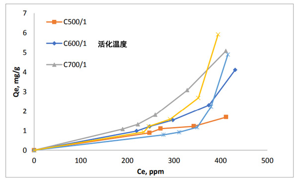 ¡¡¡¡´Óͼ2ÖпÉÒÔ¿´³ö£¬»îÐÔÌ¿ÔÚ²»Í¬µÄ»î»¯Î¶È(500¡æ£¬600¡æºÍ700¡æ)ºÍ»î»¯¼Á±ÈÂÊ(0.5¡¢1.0ºÍ1.5)ϵÄï®Îü¸½µÈÎÂÏß¡£ËƺõÔڽϵÍŨ¶ÈÏÂÎü¸½ÄÜÁ¦Ïà¶Ô½ÏµÍ¡£Õâ±íÃ÷ï®Àë×Ó¶Ô»îÐÔÌ¿±íÃæµÄÇ׺ÍÁ¦µÍ¡£¸ßŨ¶ÈÏÂÈÝÁ¿µÄÔö¼ÓÓë¿×϶ÂʳÉÕýÏà¹Ø¡£»îÐÔÌ¿µÄ½Ï´ó±íÃæ»ýÇãÏòÓÚ¸ü¶àµØÎü¸½ï®Àë×Ó¡£ÔÚµÈÎÂÏߵķÖÀàÖУ¬¸ÃµÈÎÂÏß±»ÈÏΪÊÇIIIÐ͵ÈÎÂÏߣ¬¶ÔÓÚÎÞ¿×»ò´ó¿×Îü¸½¼ÁÀ´ËµÊǵäÐ͵ġ£Òò´Ë£¬ï®Àë×ÓËÆºõ²»¸½×ÅÔÚ΢¿×ÄÚ²¿£¬¶øÊǸ½×ÅÔÚÍⲿºÍ´ó¿×±íÃæ¡£»îÐÔÌ¿¶Ôï®Àë×ÓµÄÇ׺ÍÁ¦µÍ¡£Ì¿±íÃæµÄ̼Ô×ÓÓëÈÜÒºÖеÄï®Àë×ÓÖ®¼äµÄµÍÏ໥×÷ÓÿÉÄÜÊÇÓÉÓÚÀë×ÓµÄÔ×ÓÖÊÁ¿µÍËùÖ¡£Ô×Ó¼äÊÆÏ໥×÷ÓñíÃ÷¸ÃÁ¦ÓëÏ໥×÷ÓÃÔ×ÓµÄÔ×ÓÖÊÁ¿ÒÔ¼°Ô×ÓÖ®¼äµÄ¾àÀë¾ßÓÐÕýÏà¹Ø¡£