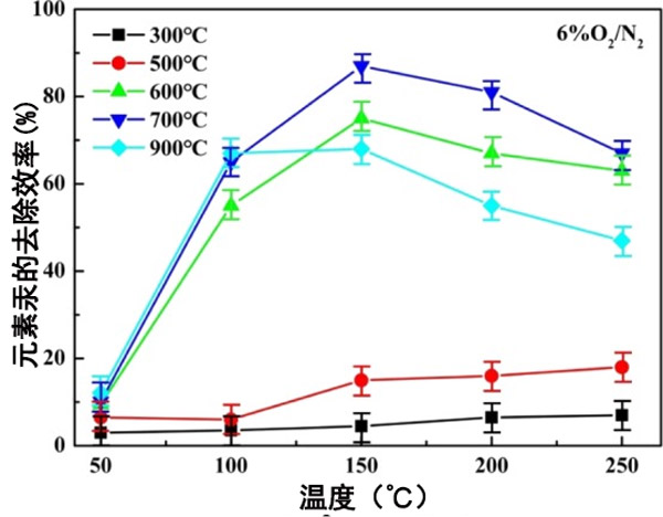¡¡¡¡ÔÚ²»Í¬µÄ·´Ó¦Î¶ÈÌõ¼þÏ£¬Ñо¿ÁËÔÚ²»Í¬ÈȽâζÈÏÂÐγɵĻîÐÔÌ¿¶ÔÔªËØ¹¯µÄÈ¥³ýЧÂÊ¡£ÈçͼËùʾͼ2£¬300Ì¿ºÍ500Ì¿ÔÚ50–250°Cʱ±íÏÖ³ö½Ï²îµÄÔªËØ¹¯È¥³ý»îÐÔ£¬ÔÚ´Ëζȷ¶Î§ÄÚÈ¥³ýЧÂÊδ´ïµ½20%ÒÔÉÏ¡£Ôڽϵ͵ÄÈȽâζÈÏÂÉú²úµÄÑùÆ·Öк¬Ñõ¹ÙÄÜÍŽ϶࣬²¢ÇÒÆäÔªËØ¹¯È¥³ýЧÂʽϲº¬Ñõ¹ÙÄÜÍÅÔÚÔªËØ¹¯µÄ´ß»¯Ñõ»¯Öв¢²»Õ¼ÓÅÊÆ¡£ÕâЩ½á¹û¿ÉÄÜÊÇÓÉÓÚÔڽϵÍζÈÏÂÈȽâʱÔÚ»îÐÔÌ¿µÄ±íÃæ¿×϶²»×㡣ʹÓÃ600Ì¿£¬700Ì¿ºÍ900̿ʱ£¬ÔªËع¯µÄÈ¥³ýЧÂÊËæ½Ï¸ßµÄ·´Ó¦Î¶ȶøÔö¼Ó£¬¶øµ±·´Ó¦Î¶ȽøÒ»²½Éý¸ßÖÁ>200°Cʱ£¬ÔªËع¯µÄÈ¥³ýЧÂÊÔò½µµÍ¡£ÕâºÜ¿ÉÄÜÊÇÓÉÓÚÒÖÖÆÔªËØ¹¯µÄÎïÀíÎü¸½ºÍÎü¸½µÄÔªËØ¹¯ÍѸ½µÄ×ÛºÏ×÷Óᣵ±·´Ó¦Î¶ÈԼΪ150°Cʱ£¬»îÐÔÌ¿±íÏÖ³öÏà¶Ô½Ï¸ßµÄÔªËØ¹¯È¥³ýЧÂÊ¡£