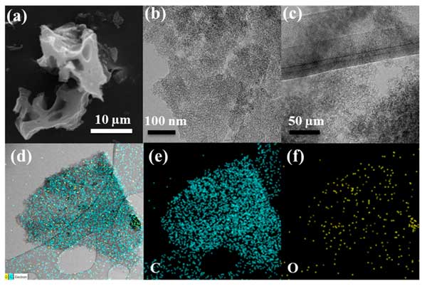 ¡¡¡¡½øÐÐSEMºÍTEM·ÖÎöÒÔ·ÖÎöËùÖÆÔìµÄ»îÐÔÌ¿µÄÐÎ̬¡£SEMºÍTEMͼÏñ(ͼ1a–c)·Ö±ð˵Ã÷ÁËËùÖÆÔìµÄ»îÐÔÌ¿µÄ¶à¿×½á¹¹¡£Õâ±íÃ÷»î»¯¼Á¿ÉÒÔÈÃÌ¿ÔÁÏÐγɶà¿×½á¹¹¡£ÀàËÆµÄ½á¹ûʾ³öÁËÓÃÓÚ´Ó²»Í¬µÄÔ²ÄÁϵõ½µÄ»îÐÔÌ¿¡£¸ù¾ÝÊý¾Ý(ͼ1d)֤ʵCµÄ´æÔÚºÍOÔ×Ó£¬²¢ÇÒ½ÒʾÁËOÔ×ÓÔÚÕû¸ö»îÐÔÌ¿µÄ̼»ùÌå¾ùÔȵطֲ¼²¢ÇÒûÓÐÆäËûÔÓÖÊÊÇ´æÔÚÓÚÑùÆ·ÖУ¬ÆäʹÓÃEDSͼÏñ½øÒ»²½Ö¤ÊµÔÚ(ͼS1)¡£Í¼1e£¬f·Ö±ð±íʾCºÍOÔ×ÓµÄÔªËØÓ³É䡣ͼÊý¾ÝÏÔʾÁËÕû¸ö¾ØÕóÖÐCºÍOµÄ¾ùÔÈ·Ö²¼¡£