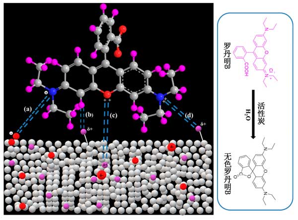 ¡¡¡¡ÂÞµ¤Ã÷B½µ½â»úÀíʾÒâͼ¡£»îÐÔÌ¿µÄ±íÃæÉÏ´æÔÚ¼¸¸ö¹ÙÄÜÍÅ£¬ËüÃÇ¿ÉÒÔÓëÂÞµ¤Ã÷BȾÁÏ·Ö×ÓÏ໥×÷Ó᣿ÉÄܵÄÏ໥×÷ÓüòÊöÈçÏ£º(a)»îÐÔÌ¿µÄ–COOH»ùÍÅÓëÂÞµ¤Ã÷BµÄ¸ºµçÐÔ»ùÍÅÖ®¼äµÄÏ໥×÷Óã¬(b)»îÐÔÌ¿µÄ–OH»ùÍÅÓëÂÞµ¤Ã÷BµÄ·¼»·Ö®¼äµÄÇâ¼ü£¬(c)Çâ¼ü»îÐÔÌ¿µÄ–OH»ùÍÅÓëÂÞµ¤Ã÷BµÄx¶Ö»ùÍÅÖ®¼ä´æÔÚ(d)»îÐÔÌ¿ºÍÂÞµ¤Ã÷BȾÁÏ·Ö×ӵıíÃæ¹ÙÄÜÍÅÖ®¼äµÄ¾²µçÏ໥×÷Óá£