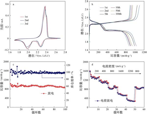 ¡¡¡¡ÎªÁËÆÀ¹À»îÐÔÌ¿×÷ΪÒõ¼«µÄµç»¯Ñ§ÐÔÄÜ£¬½«ï®²×÷ΪÑô¼«×é×°µ½ï®Áòµç³ØµÄŦ¿Ûµç³ØÖС£ÓÃÓÚµÚÒ»£¬µÚ¶þºÍµÚÈý¸öÑ»·µÄÑ»··ü°²Í¼(CV)ÇúÏßÉÏÔÚ0.05ºÁ·ü·ÃëµÄɨÃèËÙÂʵĵçλ´°¿Ú½øÐÐ(ͼ2A)¡£ÔÚµÚһѻ·ÆÚ¼ä£¬¹Û²ìµ½Á½¸öÒõ¼«·åÔÚ2.26ºÍ1.97 V£¬CVÇúÏßÖÐ×î³õµÄ¼¸¸öÑ»·¼¸ºõÖØµþ£¬Õâ±íÃ÷Ñ»·Îȶ¨ÐÔ¼«¼Ñ£¬ÈÝÁ¿±£³ÖÂÊÏà¶Ô½Ï¸ß¡£»îÐÔÌ¿µÄºãµçÁ÷³äµç/·ÅµçÇúÏߺÍÑ»·Îȶ¨ÐԵIJâÊÔÖУ¬ÈçÔÚͼÖÐËùÃèÊö2B¡¢C¡£»îÐÔÌ¿µç¼«µÄÊ״ηŵçÈÝÁ¿Îª1045 mAh·g -1£¬Ô¼ÎªÁòÀíÂÛÈÝÁ¿µÄ62.5%¡£´ËÍ⣬»îÐÔÌ¿µç¼«ÔÚµÚ100´ÎÑ»·Ê±Ò²ÏÔʾ³ö869.8mAh·g -1µÄ·ÅµçÈÝÁ¿¡£Èçͼ2dËùʾ²âÁ¿»îÐÔÌ¿µÄ±¶ÂÊÐÔÄÜ£¬ÔÚ200–3200 mA·g -1ϱíÏÖ³ö1260¡¢1050¡¢806¡¢513¡¢290 mAh·g -1µÄ¿ÉÄæ·ÅµçÈÝÁ¿¡£´ËÍ⣬µ±µçÁ÷Ãܶȴﵽ800 mA·gʱ£¬»îÐÔÌ¿Òõ¼«µÄ·ÅµçÈÝÁ¿Îª802 mAh·g -1¡£¶à¿×»îÐÔÌ¿²ÄÁϱíÏÖ³öÖеȵÄï®Áòµç³Øµç»¯Ñ§ÐÔÄÜ£¬ÏÔʾ³ö¸ßÐÔÄÜï®Áòµç³ØµÄDZÁ¦¡£